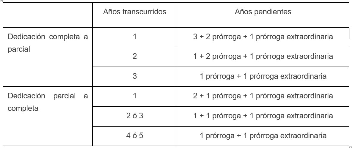El RD contempla que la realización de la tesis doctoral se puede llevar a cabo mediante los siguientes regímenes de dedicación: • Tiempo Completo. El estudiante dispondrá de un plazo de 3 años para la realización del doctorado. Una vez finalizado dicho plazo, puede solicitar una prórroga ordinaria de 1 año de duración y, de forma extraordinaria y por causas muy justificadas, podría disfrutar de una segunda prórroga de 1 año de duración. • Tiempo Parcial. El estudiante dispondrá de un plazo de 5 años para la realización del doctorado. Una vez finalizado dicho plazo, puede solicitar una prórroga ordinaria de 2 años de duración y, de forma extraordinaria y por causas muy justificadas, podría disfrutar de una segunda prórroga de 1 año de duración. En general, la dedicación será a tiempo completo. En caso de que un alumno solicite dedicación parcial a la CAPD, debe justificarlo debidamente con razones objetivas (por ejemplo, compatibilidad con el trabajo o baja médica, mediante presentación del contrato o certificación médica, respectivamente). La solicitud debe ser aprobada por la CAPD, vigilando que no se superen los límites de ratio de dedicación parcial/completa previstos en la Memoria. Una vez iniciada la tesis, se podrán solicitar cambios de dedicación siempre que estén justificados. Los cambios de dedicación se regularán de acuerdo con la siguiente tabla: